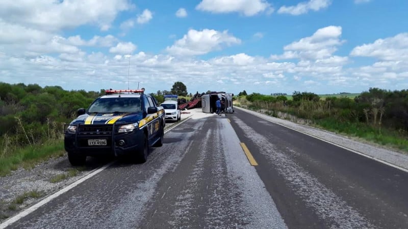 Um caminhão carregado com arroz tombou na manhã desta quarta-feira (18) na BR 293, km 210, entre Dom Pedrito e Bagé, por volta da 7h. O acidente não teve feridos e o trânsito está fluindo pela pista contrária e pelo acostamento. O local está sinalizado e estava previsto o início de trabalhos de remoção a partir das 14h. Motoristas que transitarem pela região devem redobrar a atenção.