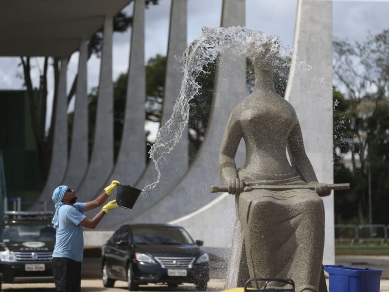 Estátua da Justiça em frente à sede do STF em Brasília passa por nova lavagem