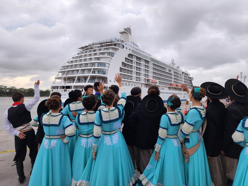 Embalado por danças e músicas tradicionalistas interpretadas por integrantes do CTG Estância de São Pedro, o navio Seven Seas Voyager atracou no berço cinco do Porto do Rio Grande, na quinta-feira (26). A embarcação, de bandeira das Bahamas, é a segunda da temporada 2022/2023 de cruzeiros a passar pelo município. Rio Grande seria a última cidade brasileira a ser visitada pelo navio antes de seguir para Punta del Leste, no Uruguai. A bordo estão 680 turistas americanos que percorreram a costa brasileira desde o Porto de Santos, no litoral paulista. Além das danças típicas da cultura gaúcha, os passageiros puderam conhecer o artesanato local e levar uma lembrança da cidade mais antiga do estado. Os turistas também fizeram passeios guiados pelo Centro Histórico. A embarcação zarparia no final da tarde de sexta-feira.