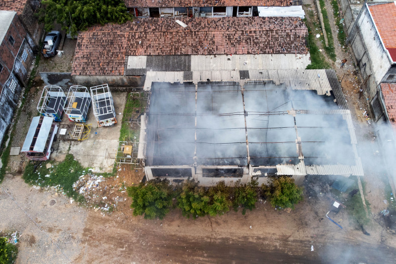Vista aérea do do armazém comercial que foi incendiado em Natal, no Rio Grande do Norte, nesta quinta-feira (16). Integrantes de grupo criminoso incendiaram carros, atiraram contra prédios públicos e instauraram o terror na quarta-feira (15), em uma onda de depredação que, segundo autoridades, já dura duas noites no Nordeste do país. Policiais afirmaram que, no RN, os ataques começaram no final de segunda-feira (13), e foram planejados de dentro de um presídio por membros de facções. Os ataques seriam uma forma de protesto contra as condições do cárcere no estado, além de uma retaliação as novas regras relacionadas a facções criminosas no sistema penal brasileiro.
