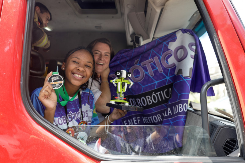 Recebidos com desfile em caminhão de bombeiros, buzinaços e aplausos da vizinhança, os “Lobóticos” retornaram a comunidade da Lomba do Pinheiro na manhã desta sexta-feira (28). A equipe de robótica formada pelos estudantes Lara Hoffmann, Vitor Machado, Nathállya Gonçalves, Matheus da Rocha, Sury da Silva e Gabrielli Welter, com a liderança da professora Cristiane Cabral, reencontrou os demais colegas na Escola Municipal Heitor Villa Lobos. Eles conquistaram o prêmio de Melhor Modelo de Solução, na First League Explorer, em Houston, nos Estados Unidos. A recepção foi organizada pela subprefeitura da região.