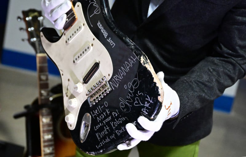Uma guitarra destruída durante uma apresentação pelo rockeiro Kurt Cobain, líder do Nirvana, vai ser leiloada nos Estados Unidos no final de maio. O instrumento, uma Fender Stratocaster, foi remontada, porém não pode ser usada, segundo Kody Frederick, da casa de leilões Julien's Auctions, que espera que o artefato musical alcance a faixa dos 80 mil dólares (cerca de R$ 400 mil). A guitarra foi destruída pelo músico no palco em uma noite que a banda tocou uma versão de "Smells Like Teen Spirit", uma das músicas mais famosas do Nirvana, meses antes de seu lançamento. Com uma vida marcada por polêmicas, Cobain se suicidou em abril de 1994, aos 27 anos. O leilão que venderá o item também inclui peças relacionadas a Eddie Van Halen, Elvis Presley e Fred Mercury.
