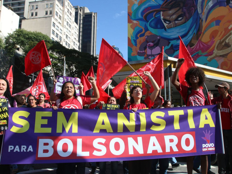 O ex-presidente Jair Bolsonaro está sendo julgado pelo TSE por abuso de poder político e uso indevido dos meios de comunicação durante seu mandato, e mais especificamente por comentários de ataque à democracia feitos durante reunião com embaixadores, em julho de 2022. Em São Paulo, Movimento social Frente Povo Sem Medo fez ato em frente ao Tribunal Regional Eleitoral (TRE) em favor da inelegibilidade e da prisão de Bolsonaro. Nos cartazes vistos na concentração, militantes relembram momentos polêmicos durante os anos de mandato, além de pedirem a não anistia. O primeiro dia de julgamento foi nesta quinta-feira (22), mas foi adiado para terça-feira (27). Enquanto atos de manifestação aconteciam em São Paulo, e julgamento do TSE em Brasília, Bolsonaro estava em visita à Transposul, em Porto Alegre, para se encontrar com apoiadores.