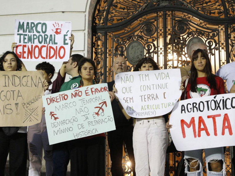 Manifestantes ambientalistas realizam protesto nesta sexta-feira (23), no Rio de Janeiro. As pautas trazidas pelos militantes incluem as mudanças na legislação ambiental aprovadas pelo Congresso Nacional, que realiza uma troca de transferência de trabalhos entre os Ministérios, entre elas tirando a gestão de dados de saneamento básico, de resíduos sólidos e de recursos hídricos do Ministério do Meio Ambiente e passando para o Ministério das Cidades. De acordo com a ministra Marina Silva, as mudanças vão ‘na contramão daquilo que significa ter uma legislação ambiental robusta’. Além disso, ativistas também protestam contra o recente Projeto de Marco Temporal Indígena. Este projeto coloca data fixa para demarcação das terrar indígenas, mas o texto analisado pode restringir o território nativo e o liberar para latifundiários.