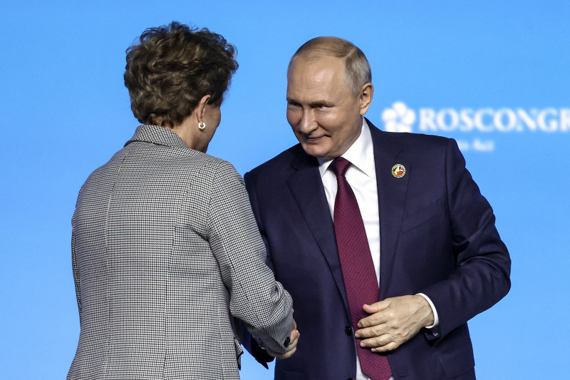 A presidente do banco dos Brics, Dilma Rousseff, se reuniu nesta quarta-feira (26), com o presidente da Rússia, Vladimir Putin, em São Petersburgo. Em nota, a ex-presidente brasileira disse que o banco não considera ter novos projetos na Rússia, atualmente sancionada por países ocidentais por sua guerra na Ucrânia. O encontro ocorreu em meio à 2ª Cúpula Rússia-África, que antecede a reunião dos países do Brics - acrônimo para Brasil, Rússia, Índia, China e África do Sul. "O NDB (Novo Banco de Desenvolvimento, na sigla em inglês) reiterou que não está considerando novos projetos na Rússia e opera em conformidade com as restrições aplicáveis nos mercados financeiros e de capitais internacionais. Quaisquer especulações sobre tal assunto são infundadas." A reunião ocorreu no Palácio Constantino, em São Petersburgo.