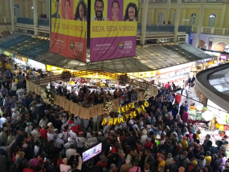 Centenas de pessoas acompanharam, nessa quinta-feira (3), os festejos do Mercado Público de Porto Alegre, que completou 150 de existência. A multidão se aglomerou para participar da data especial, que exibiu ainda um letreiro "Feliz Aniversário". Durante a manhã, o aniversário foi celebrado no átrio com direito a bolo, balões, música e o tradicional Parabéns a você, entre outras atrações. A abertura foi marcada pelo som da Banda Municipal. Já o bolo gigante, recheado de doce de leite e nozes, foi preparado por alunos da Faculdade de Gastronomia da UniRitter. O Mercado Público, construído em 1869, segue como um dos principais pontos turísticos da capital, apesar de ter passado por um grave incêndio em 2013 e com áreas ainda sem operações. O complexo, que vende de pescados a especiarias, é um dos pontos que mais atrai fluxos de diversos bairros. Muita gente só vai à região para as comprinhas no 'Mercado'.