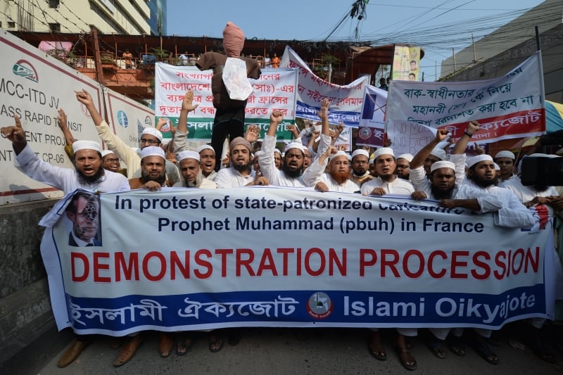 A decapitação do professor de história Samuel Paty na França por um radical islâmico, após ter exibido uma charge de Maomé, profeta da religião, continua a ecoar. Depois do presidente francês, Emmanuel Macron, ter se manifestado a favor da liberdade de expressão quanto ao uso da charge, o presidente da Turquia, Recep Tayyip Erdogan, fez uma declaração dizendo que Macron "precisava de um tratamento mental" diante da postura do mandatário francês. No começo de outubro, Macron havia dito que iria lutar contra o que chamou de "separatismo islâmico". A tensão subiu entre as duas nações, e Erdogan conclamou boicote a produtos de origem francesa. Em Daca (foto), capital de Bangladesh, país cuja população tem maioria muçulmana, estima-se que cerca de 40 mil pessoas foram às ruas protestar contra a nação europeia.
