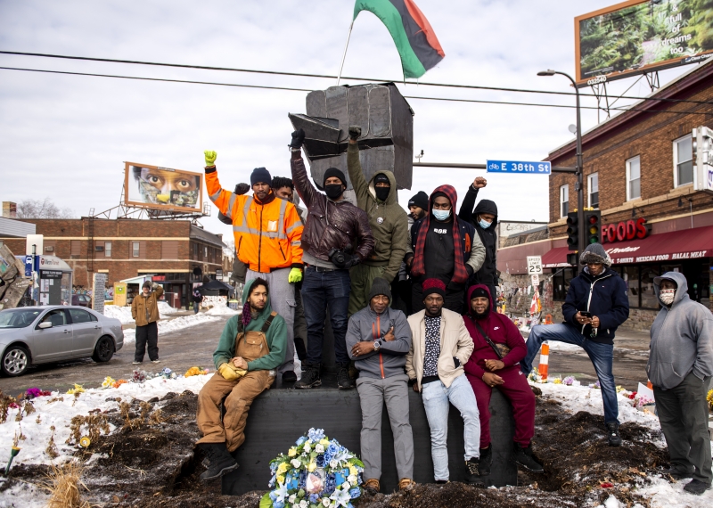 No cruzamento das vias onde George Floyd foi assassinado em Minneapolis (estado de Minnesota, Estados Unidos), sua cidade natal, uma estátua que simboliza uma mão erguida, símbolo do movimento Black Lives Matter, foi construída. Na foto, membros da comunidade local e artistas independentes se juntam para celebrar o novo monumento, feito de aço e que substitui uma versão anterior de madeira. George Floyd, homem negro de 47 anos, foi assassinado no dia 25 de maio de 2020 pelo então policial Derek Chauvin, responsável por se ajoelhar no pescoço de Floyd. Outros três policiais estiveram envolvidos com o caso. A morte de Floyd gerou uma onda de protestos contra o racismo nos Estados Unidos e em vários outros países.