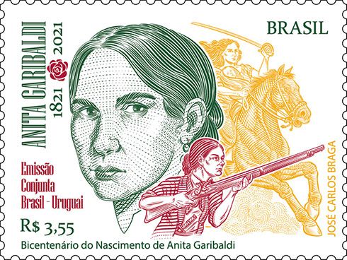 Entra em circulação nesta segunda-feira (30) a Emissão Conjunta Brasil – Uruguai: Bicentenário do Nascimento de Anita Garibaldi. 120 mil exemplares serão disponibilizados a venda na loja virtual e nas principais agências dos Correios, o preço unitário é de R$ 3,55. Anita Garibaldi (1821-1849) nasceu no sul de Santa Catarina, onde hoje é o município de Laguna, e é considerada um símbolo de amor, determinação, bravura e capacidade de luta por ideais. Conhecida como a “heroína dos dois mundos”, Anita já recebeu diversas homenagens no Brasil e na Itália, e está entre as 20 mulheres mais importantes da história do Brasil. Lutou na Revolução Farroupilha, na Batalha dos Curitibanos e na Batalha de Gianicolo, na Itália. A arte desta emissão traz as três faces da homenageada - a mulher, a guerreira e a mãe -, além da gravura de uma rosa, símbolo de Anita. Nos 200 anos desde seu nascimento, já havia sido estampa de dois selos dos Correios, em 1967 e 1971.