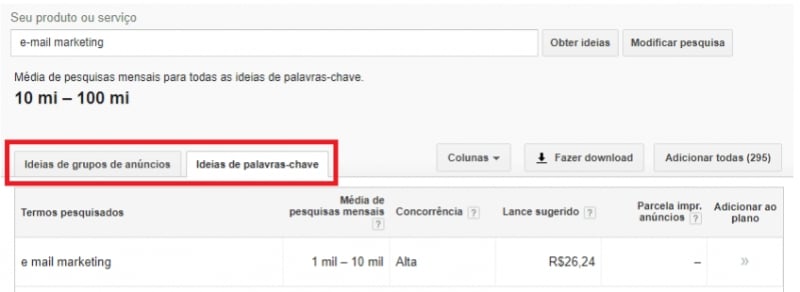 A partir da combinação de planejador e Ads, é possível buscar pelas palavras-chave e analisar o investimento necessário para utilizar cada uma delas. Ao pesquisar por termos relacionados aos serviços que você oferece, o planejador apresentará as palavras-chave que podem ter maior relevância para você.