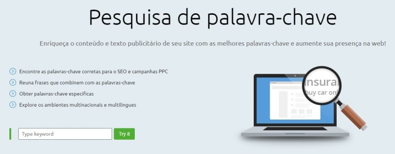 Assim como os exemplos apresentados nesse post, basta digitar a palavra-chave para obter o volume de pesquisas orgânicas e pagas, palavras-chave relacionadas ou complementos, entre outras informações.