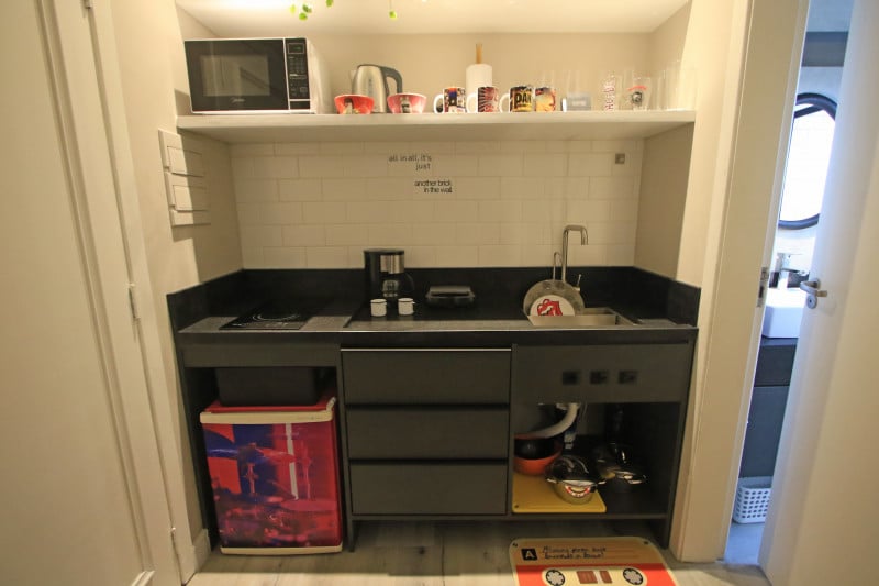 O sócio do negócio conta que o proprietário de um dos apartamentos é apaixonado por música, principalmente por rock e, por isso, sugeriu, junto com a arquiteta, fazer um quarto com essa temática. O lugar tem detalhes que lembram o estilo musical, como os pratos, copos e talheres, quadros na parede, uma guitarra pendurada em cima da cama, caixas de som espalhadas pelo quarto, inclusive no banheiro, e outras decorações. “O apartamento tem muita sinergia com o prédio, com a região e com o público alvo, de estar em um bairro extremamente cultural e jovem. Pensando nessa pegada diferente, de trazer uma experiência para o cliente, de não ser apenas um apartamento para locação, mas trazer um conceito legal, uma vivência para quem gosta”, comenta Gibran.