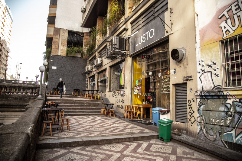 O ponto nas escadarias do Viaduto Otávio Rocha foi o primeiro e único visitado pelos sócios. "Começamos a olhar imóveis e, no dia seguinte, já pegamos as chaves do espaço. Em uma semana alugamos, sem plano de negócio, sem cardápio, não tinha nada. Ficamos surpresos por não ter um negócio no ponto porque é um baita espaço, então alugamos e fomos de improviso", admite Adelino sobre o começo do bar. "Era geladeira de casa, sofá de casa. Nós sabíamos que iria rolar, que iria aparecer gente, mas o início foi um negócio de guerrilha", lembra o empreendedor.