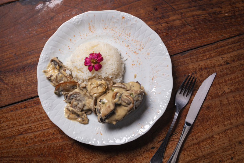 Filé individual grelhado ou à milanesa ao molho de champignon. Acompanha porção de arroz branco.