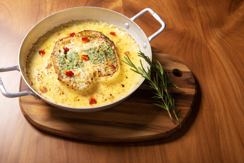 Prato Principal: polenta mole com ragu de porco (polenta mole com queijo mussarela, ragu de porco folhas de agrião).
