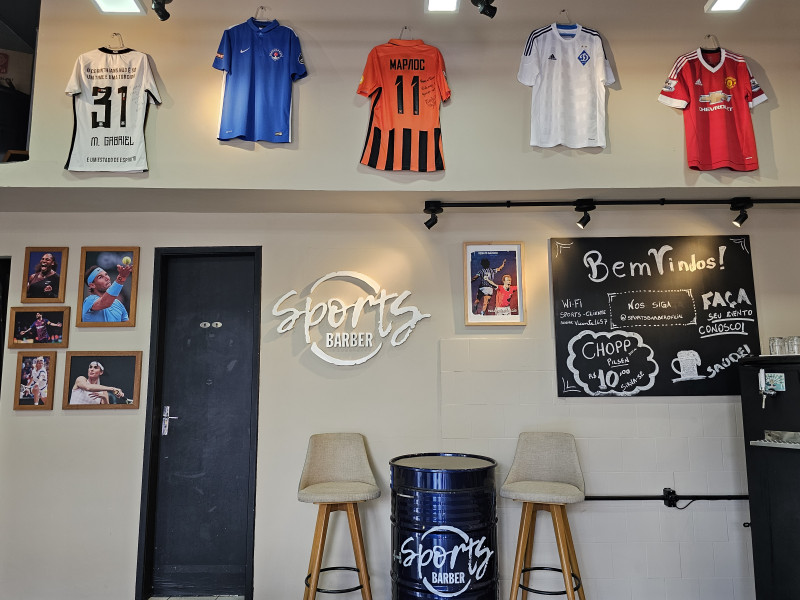 A Sports Barber possui áreas com televisão, sinuca, churrasqueira e chopeira, além de uma exposição de camisetas assinadas por ex-jogadores da dupla Grenal, como Douglas Costa, Taison e Lucas Leiva. Os atletas são clientes da academia Team Villeroy. O objetivo da decoração é o mesmo do serviço de assinatura: conseguir reter o público por um período maior dentro da barbearia, gerando curiosidade e identificação. “A ideia é vincular o serviço de corte e barba com diversão. Nosso objetivo é que o cliente possa vir com um amigo jogar uma sinuca, tomar um chope e cortar o cabelo, por exemplo”, diz Newmar.