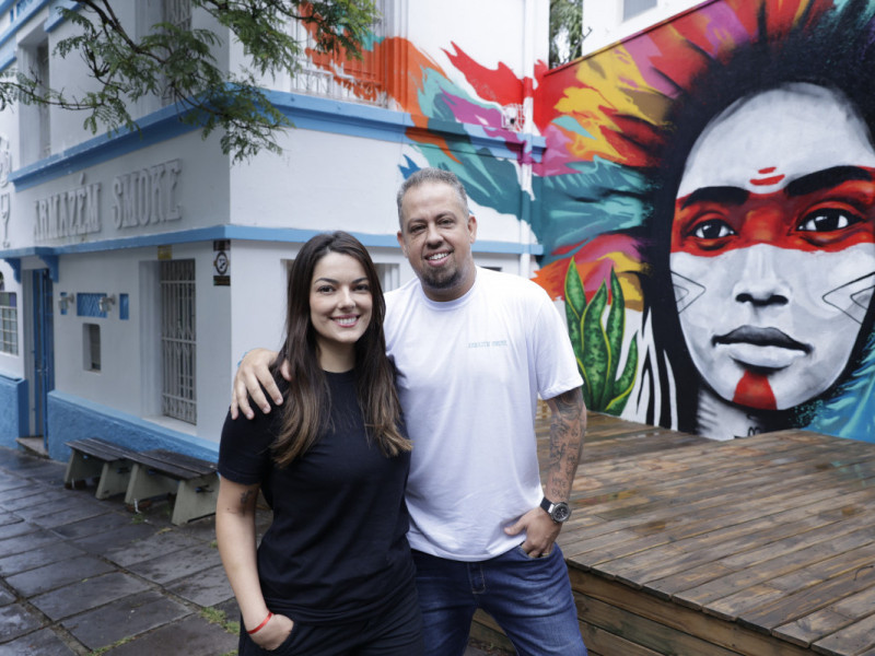 Vini Guedes e Mel Medeiros são os proprietários do Armazém Smoke. “Começamos a entrar no negócio de defumação, porque percebemos que era uma tendência. No começo fazíamos apenas delivery, mas na volta da pandemia a demanda pelo espaço físico era muito grande, todo mundo queria sair de casa”, explica o empreendedor. Até então, o nome da hamburgueria era Smoke Guedes, mas a fixação em um local alterou também a marca. “Nós ficamos no espaço onde antes era o Armazém Scholles, um lugar supertradicional com mais de 60 anos. O nome armazém é uma referência para a comunidade, então resolvemos preservar”, contextualiza Vini.