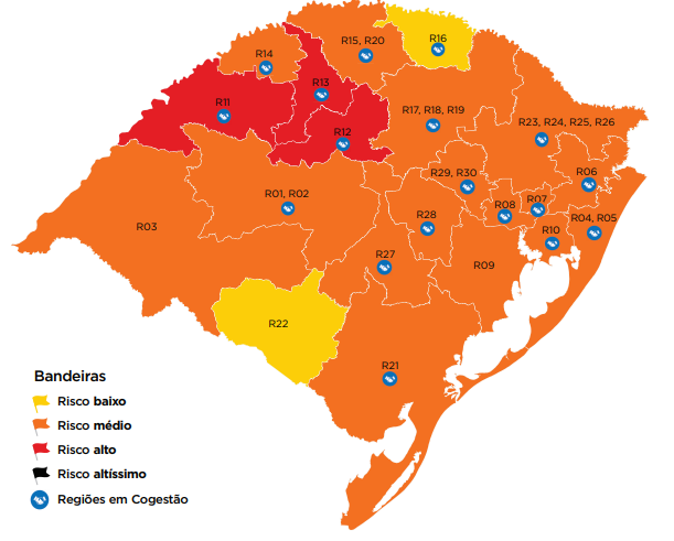 Das 21 regiões Covid, apenas Uruguaiana, Bagé e Guaíba não aderiram à cogestão do distanciamento controlado, o que permite a 18 áreas adotarem protocolos alternativos às bandeiras definidas, mediante envio de protocolos próprios. Prefeituras também poderão solicitar reconsideração à classificação de risco até as 6h de domingo (8).