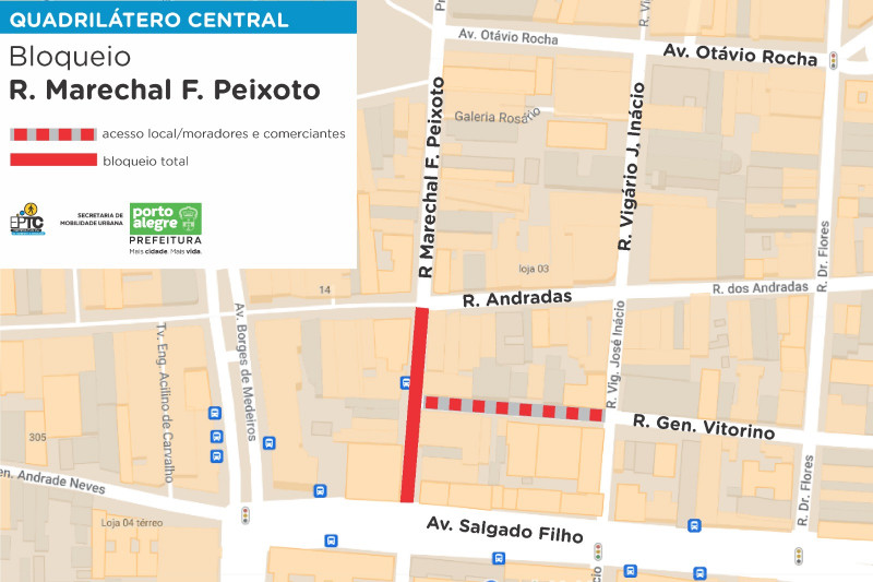 Em razão do avanço das obras, a rua Marechal Floriano Peixoto terá bloqueio total no trecho entre a rua dos Andradas e a avenida Senador Salgado Filho. A área terá circulação de pedestres e o acesso à rua General Vitorino será apenas local pela rua Vigário José Inácio na contramão, tendo em vista que a rua General Vitorino já estava bloqueada para circulação de veículos, por conta das obras do quadrilátero desde outubro de 2022. Os trabalhos seguem o cronograma previsto pela Secretaria Municipal de Obras e Infraestrutura (Smoi). As bancas de floristas já estão em fase de conclusão e logo serão entregues aos comerciantes.