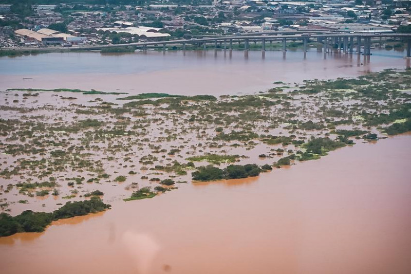 O prefeito de Porto Alegre, Sebastião Melo, sobrevoou as áreas afetadas pelas enchentes, passando na região das Ilhas, Zona Sul (Vila dos Sargentos) e Zona Norte (Fiergs). A elevação do nível das águas impactou vias próximas à ponte do Guaíba, inviabilizando a passagem no entorno. (Foto: Cesar Lopes/PMPA).