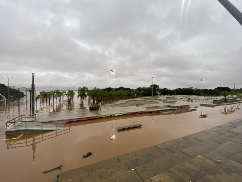 A Orla do Guaíba de Porto Alegre amanheceu totalmente debaixo d’água. Com isso, a maior pista de skate da América Latina virou uma piscina gigante. O avanço do nível foi rápido durante a noite, pois nesta quinta-feira (2) ainda não havia alagamento na área.