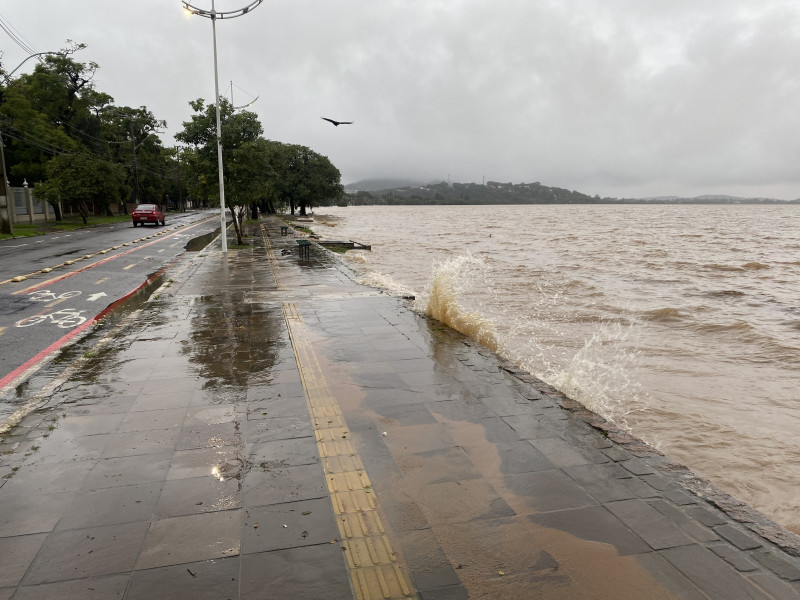 A faixa de areia da praia de Ipanema, na Zona Sul de Porto Alegre, já está totalmente encoberta pela água na manhã desta sexta-feira (3). Com ondas, o Guaíba avança pela calçada e começa a alagar a via em frente à orla. Com o cenário incomum, pássaros aproveitam o volume de água para nadar.
