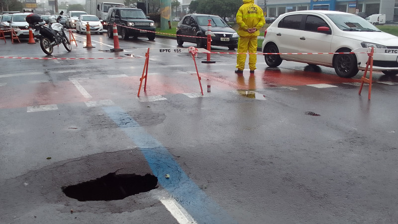 Os agentes da EPTC bloquearam na manhã desta sexta-feira (24) as duas vias da avenida Ipiranga, próximo ao museu da PUC, no sentido Centro/bairro. Um buraco se abriu na pista, e há risco de afundamento no trecho. Na quinta-feira (23), Porto Alegre registrou um grande volume de chuva, com vários pontos de alagamento. O nível do Arroio Dilúvio subiu e a água se aproximou da altura dos taludes.