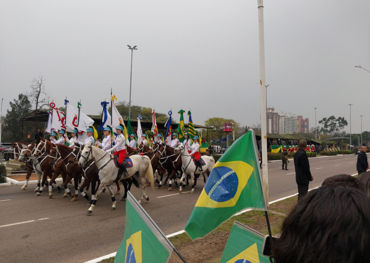 Nem o templo nublado e alguns pingos de chuva impediram o público de acompanhar o desfile do 7 de setembro na capital gaúcha realizado neste sábado, a partir das 10h, na Avenida Edvaldo Pereira Paiva, entre a região do estádio Beira-Rio e o cruzamento com a Avenida Ipiranga. De acordo com informações do Comando Militar do Sul, em torno de cinco mil pessoas, entre civis e militares, estavam previstas para desfilar em homenagem aos 202 anos da Independência do Brasil