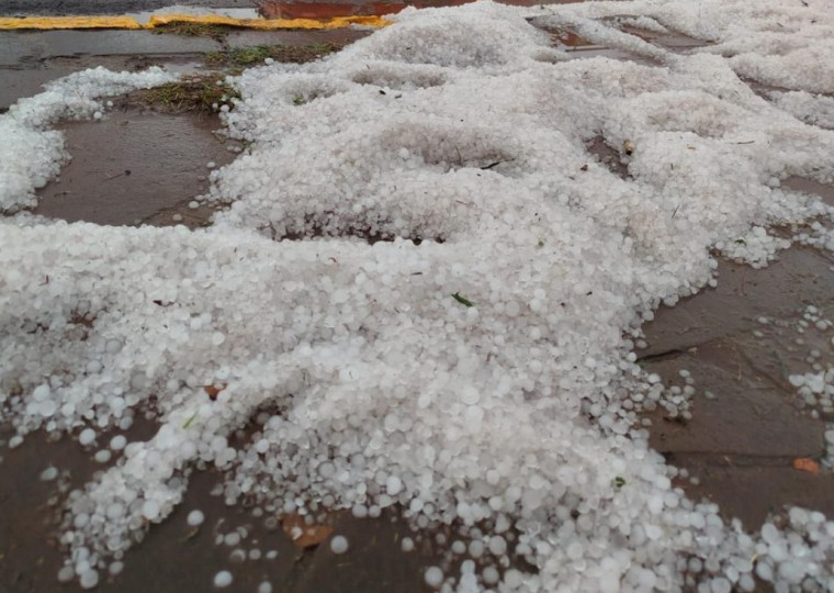 "Foram registradas pancadas de chuva forte e queda de granizo miúdo em pontos isolados. Apesar do pequeno diâmetro, o granizo caiu em grande quantidade — fenômeno conhecido como “saraivada de granizo”, explica a Defesa Civil, em nota.