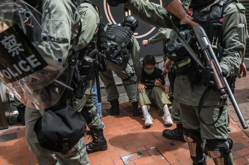 Entre essas primeiras prisões sob a lei de segurança, que em casos extremos prevê prisão perpétua e julgamento por Pequim, está uma garota de 15 anos. Ela carregava um cartaz com um dos slogans clássicos dos protestos: "Independência de Hong Kong, revolução do nosso tempo", em cantonês e inglês.