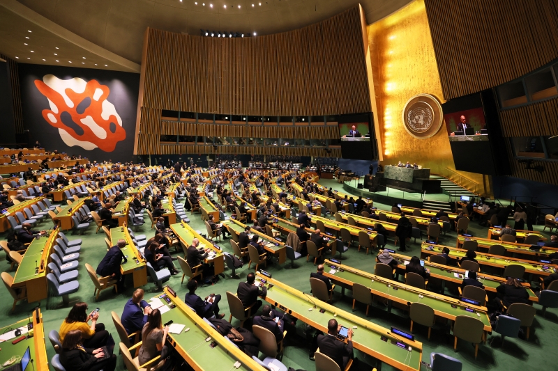 Ao lembrar a reunião de delegações entre a Rússia e a Ucrânia na fronteira com Belarus, que ocorre hoje paralelamente à reunião da ONU, Abdulla Shahid avaliou que "abriu-se uma janela para o diálogo, uma sombra de esperança". "Temos que dar uma oportunidade para a paz. Armas são melhores quando não são usadas", discursou o presidente da Assembleia Geral da ONU.