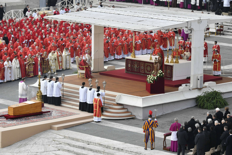 O papa argentino falou diante do caixão de madeira, onde jaz o corpo de Joseph Ratzinger, com uma cópia dos Evangelhos em cima e colocado no átrio da Basílica. A presença de um papa no funeral de seu predecessor não tem precedentes na história recente da Igreja.