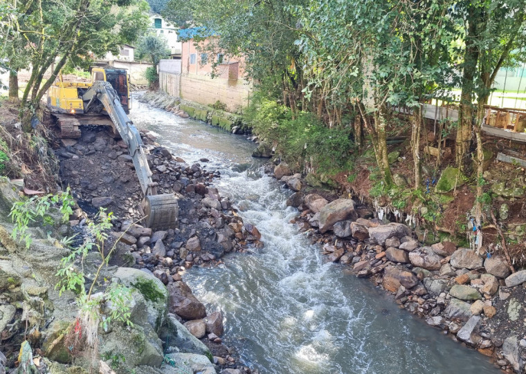 Na região de Galópolis, as equipes da prefeitura de Caxias do Sul continuam as operações na rua Angelo Basso, no Arroio Pinhal. As atividades envolvem a remoção de detritos, a reconstrução de pontos críticos e o fortalecimento de bases de contenção que foram danificadas pelas chuvas. O objetivo é avançar o máximo possível dentro do canal, utilizando maquinário pesado para assegurar a estabilidade e o fluxo adequado das águas.