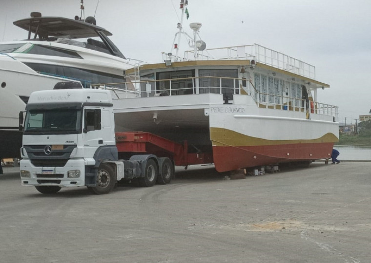 O barco em estilo catamarã será transportado por via terrestre e saiu de Itajaí-SC no domingo (6). Por se tratar de uma grande embarcação, o transporte somente pode ocorrer durante à noite, quando o fluxo de veículos nas rodovias não é tão intenso.