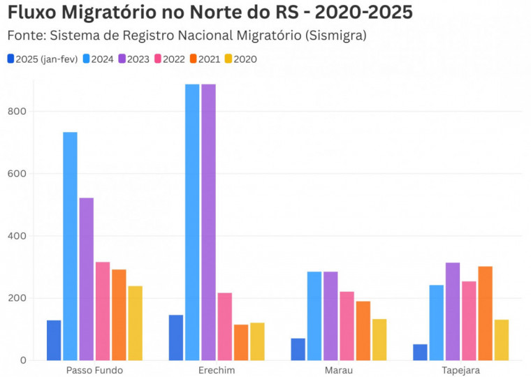 Nos últimos cinco anos, de janeiro de 2020 a fevereiro de 2025, quatro municípios do Norte do Rio Grande do Sul – Erechim, Marau, Passo Fundo e Tapejara – receberam 12,6% de todo o fluxo migratório registrado no Estado no período. De acordo com dados do Sistema de Registro Nacional Migratório (Sismigra), 55,8 mil pessoas de 142 países chegaram ao RS nos últimos cinco anos, e pouco mais de 7 mil delas se estabeleceram nessas quatro cidades em busca de melhores condições de vida.