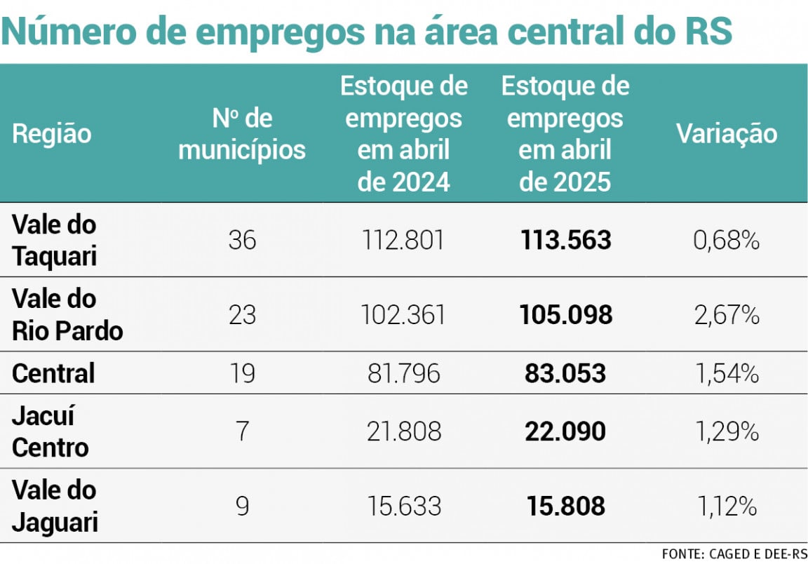 Somadas, as Regiões Central, Vale do Taquari, Vale do Rio Pardo, Vale do Jaguari e Jacuí Centro – que estão contempladas no segundo capítulo do Mapa Econômico do RS em 2025 – cresceram 1,5% no número de empregos formais. A variação considera o período de abril de 2024 a 2025.
