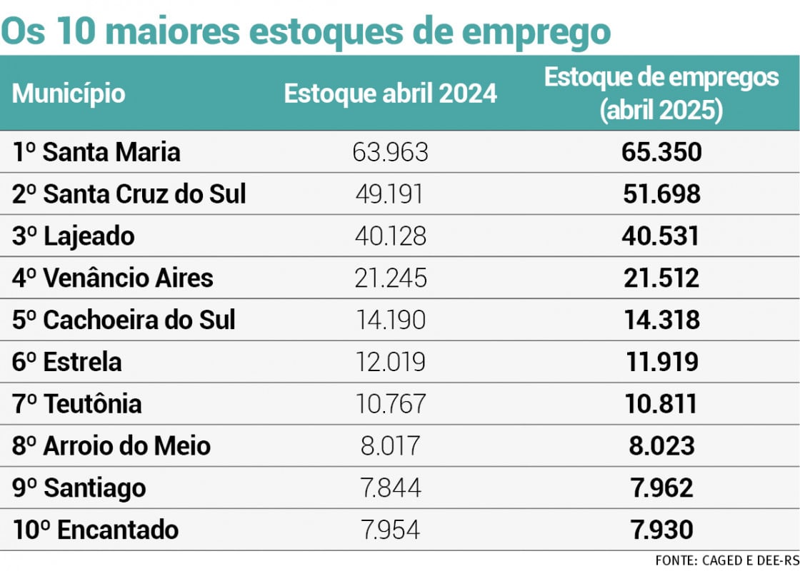 No caso de Santa Cruz do Sul, o grande destaque está na indústria fumageira. Afinal, o setor empregava 10.866 pessoas em abril de 2025, 1.122 a mais do que o mesmo mês do ano anterior. O crescimento foi de 11,5%. A área, aliás, é responsável por um grande volume dos empregos do município: 21% dos 51.680 postos de trabalho locais. O impulso também coloca o Vale do Rio Pardo em uma escala de geração de empregos maior do que a média estadual, com uma variação de 2,67%.