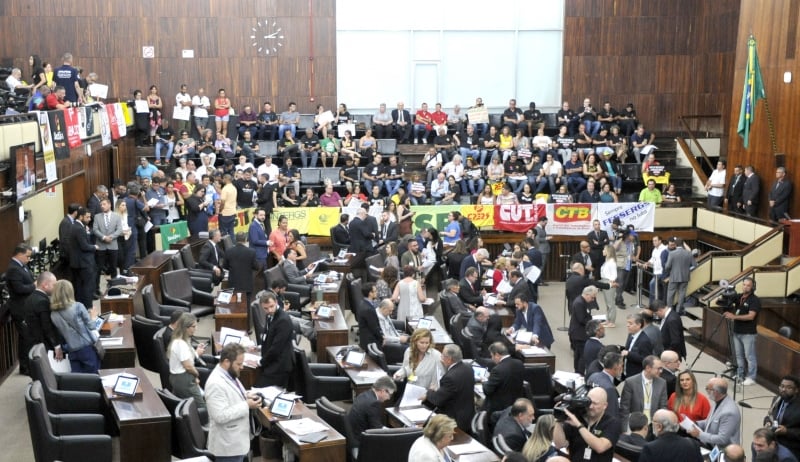 Do lado de fora da Assembleia e também nas galerias do plenário, servidores se mobilizaram contra as mudanças.