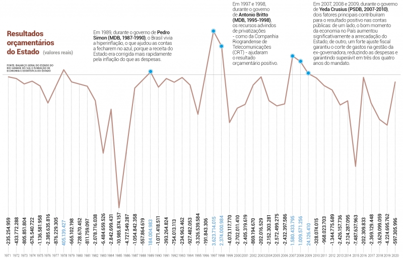 Desde a redemocratização do Brasil, o Rio Grande do Sul teve apenas seis resultados orçamentários positivos: um em 1989, durante o governo de Pedro Simon (MDB, 1987-1990); dois em 1997 e 1998, durante o governo de Antônio Britto (MDB, 1995-1998); e três de 2007 a 2009, durante o governo de Yeda Crusius (PSDB, 2007-2010). Os superávits foram alcançados não só devido ao esforço dos governos da época, mas também devido a fatores externos e conjunturais.
