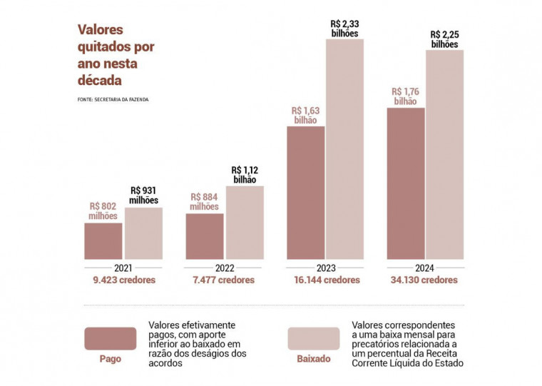 Durante todo o ano passado, o RS baixou R$ 2,25 bilhões, o que representa um montante nominal levemente inferior aos R$ 2,33 bilhões de 2023, conforme dados da Secretaria Estadual da Fazenda (Sefaz). A partir dos pagamentos por acordos, porém, os valores pagos e o número de pessoas físicas ou jurídicas que os receberam foram superiores: R$ 1,76 bilhão em 2024, atingindo 34.140 credores, ante R$ 1,63 bilhão no ano anterior, com impacto para 16.144 beneficiários.